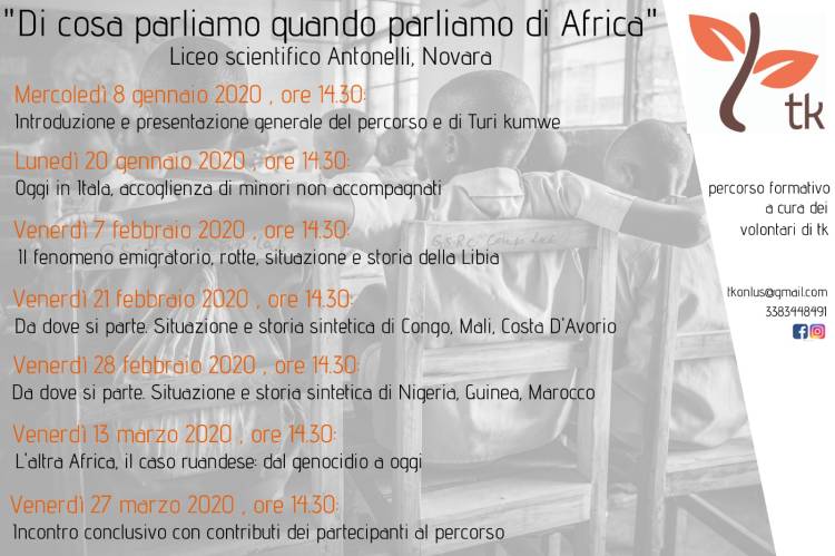 Un ciclo di sette incontri tenuti dai nostri volontari, coinvolgerà 30 studenti e studentesse del Liceo Scientifico Antonelli di Novara, da inizio gennaio a fine marzo 2020. Il percorso intende “parlare di Africa ai giovani”, per informare e andare al di là dei frequenti stereotipi riprodotti grossolanamente dai mass-media italiani. Nel percorso verrà analizzata la storia del fenomeno migratorio dal continente africano, partendo dalle cause, spesso situate nella storia coloniale dei diversi Paesi africani, e arrivando anche a un’analisi delle politiche e pratiche di accoglienza sul territorio italiano. Agli studenti coinvolti sarà richiesto anche lo svolgimento di un piccolo lavoro di ricerca individuale o a gruppi da presentare alla fine del percorso.